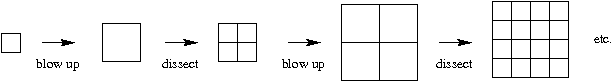 A substitution tiling is created by a two-step process known as inflation. The first step of inflation is to enlarge an existing tile (or tessellation). The second step is to dissect each large tile into smaller tiles which are the same size and shape as the tiles of the original tessellation. Here is an example in which each larger square is cut into four smaller squares at each dissection step: