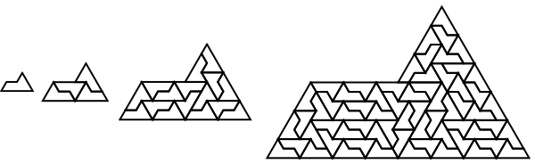 Interesting rep-tiles can be used to make substitution tilings which are not periodic. For example, here are the first few inflations of the Sphinx substitution tiling: