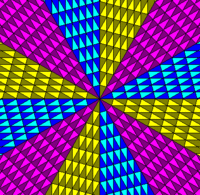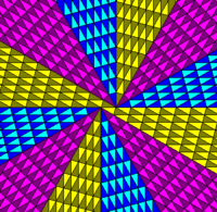 Another way to create beautiful non-periodic tilings is to choose tiles which can form concentric rings. The 30°-75°-75° isoceles triangle is one example, and it can form a radial tiling as shown below. By shifting the upper half of the radial tiling one triangle to the right, a spiral tiling is formed.