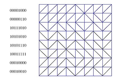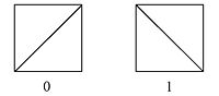 We label the squares with “0” and “1”. A random number generator (or a coin flip) can generate a string of 0’s and 1’s, which translate into squares that result in a tessellation with no translation symmetry. As an example, 64 random numbers were used to generate the following portion of an aperiodic tessellation: