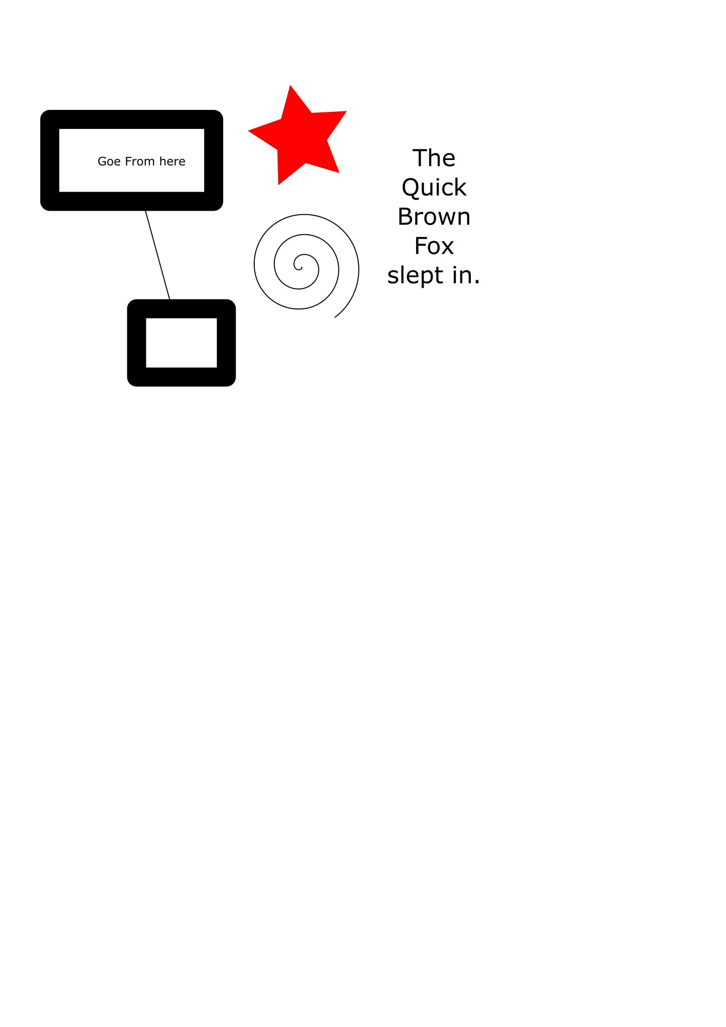 Two connected rounded boxes with thick borders. Text in higher box says "Goe from here". A red star. A spiral. Text in a large, bold font that says "The quick brown fox slept in".