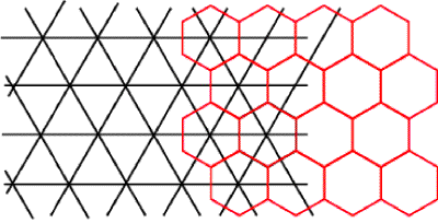 Repeating the dual returns to the original tessellation, which means that neither one is particularly more original than the other, so we just say that two tessellations are dual. For example, the tessellation by equilateral triangles and the tessellation by regular hexagons are dual: