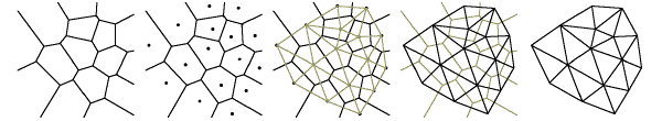 To find the dual to a tessellation, start with a tessellation by polygons, and put a point inside each polygon of the tessellation. Connect these new points by line segments, connecting two points when their enclosing polygons share an edge. The dual tessellation is made up of these points and the edges connecting them.
