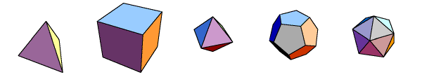From left to right we see: Tetrahedron, Cube, Octahedron, Dodecahedron, Icosahedron.