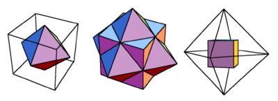 | Octahedron inside cube; Cube-octahedron compound; Cube inside octahedron. | A Japanese temari ball showing duality of the cube (orange) and octahedron (purple). (D. Abolt) |